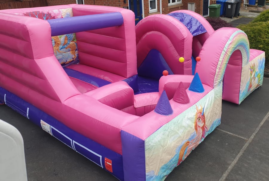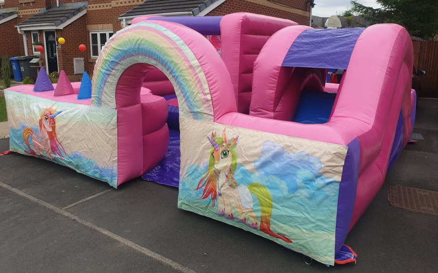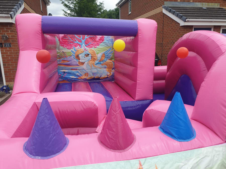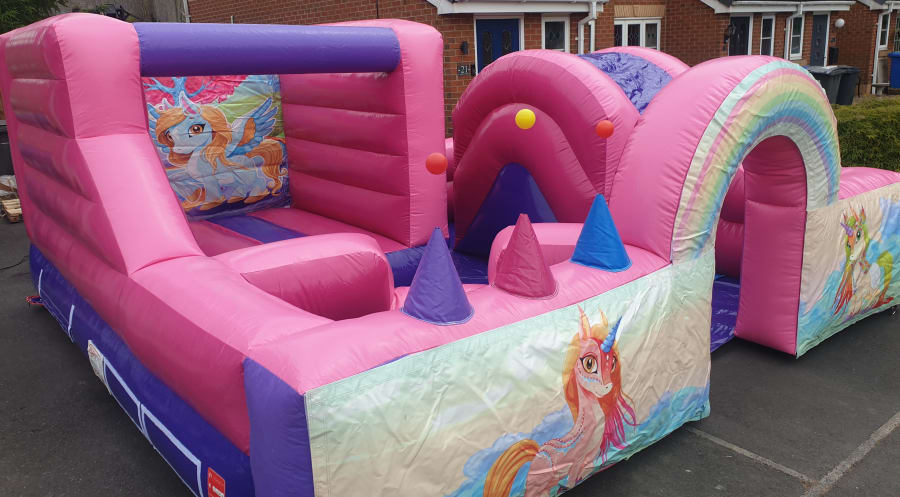 Our Unicorm play park comes complete with a full size bouncy castle, ball pool, slide, archway, air juggler cones, containment barrier, fitted groundsheet, velcro steps and padded slip sheet for extra safety.